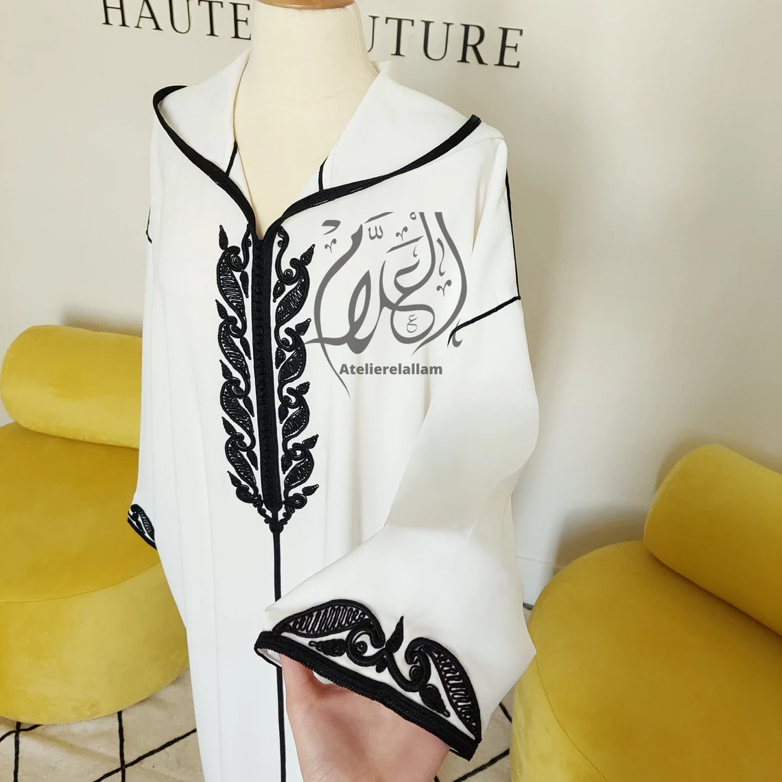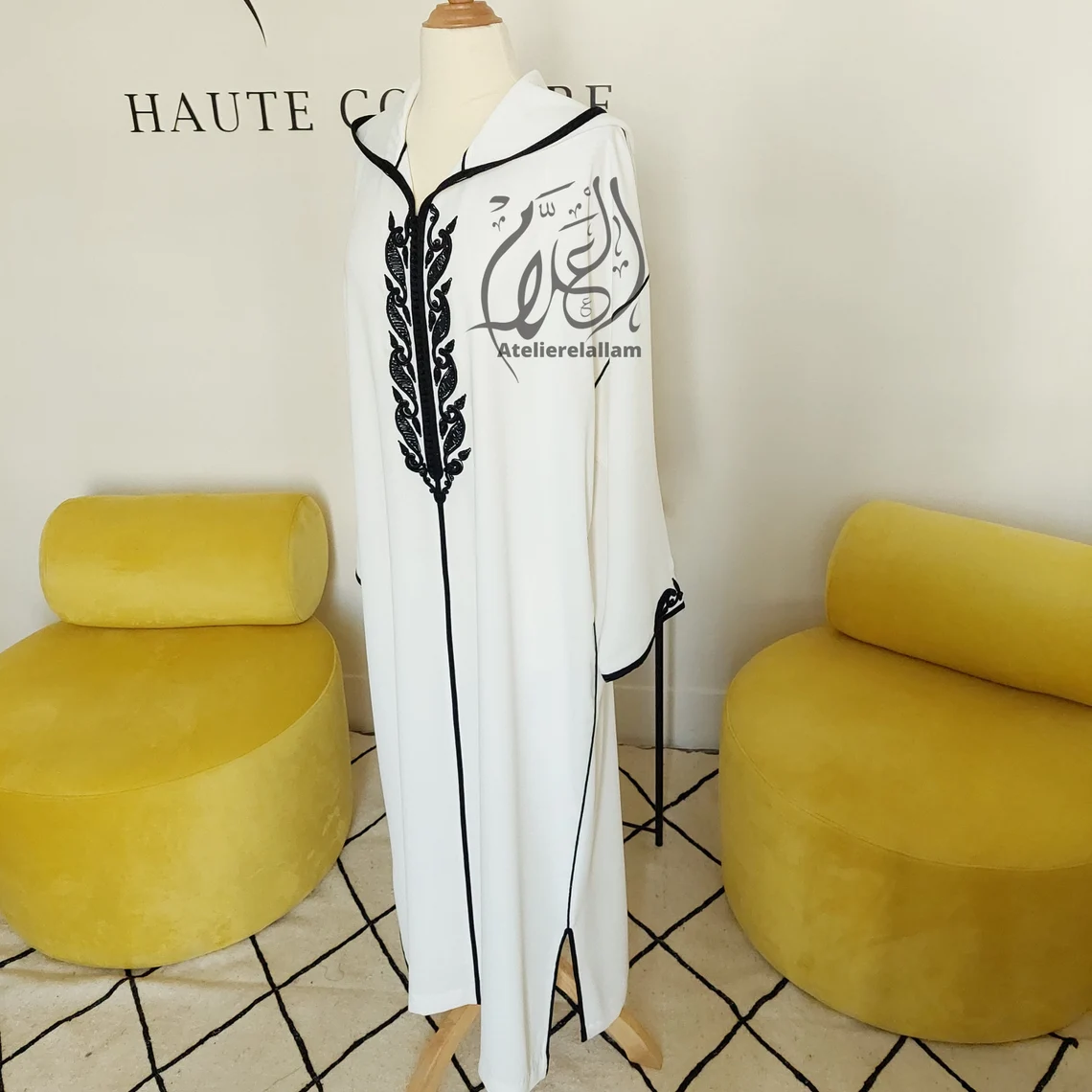 Avec son jeu de contrastes noir sur blanc, cette djellaba offre un style à la fois sobre et sophistiqué. La broderie noire, fine et élancée, sublime le devant avec caractère. Elle incarne une élégance moderne inspirée de la tradition marocaine.