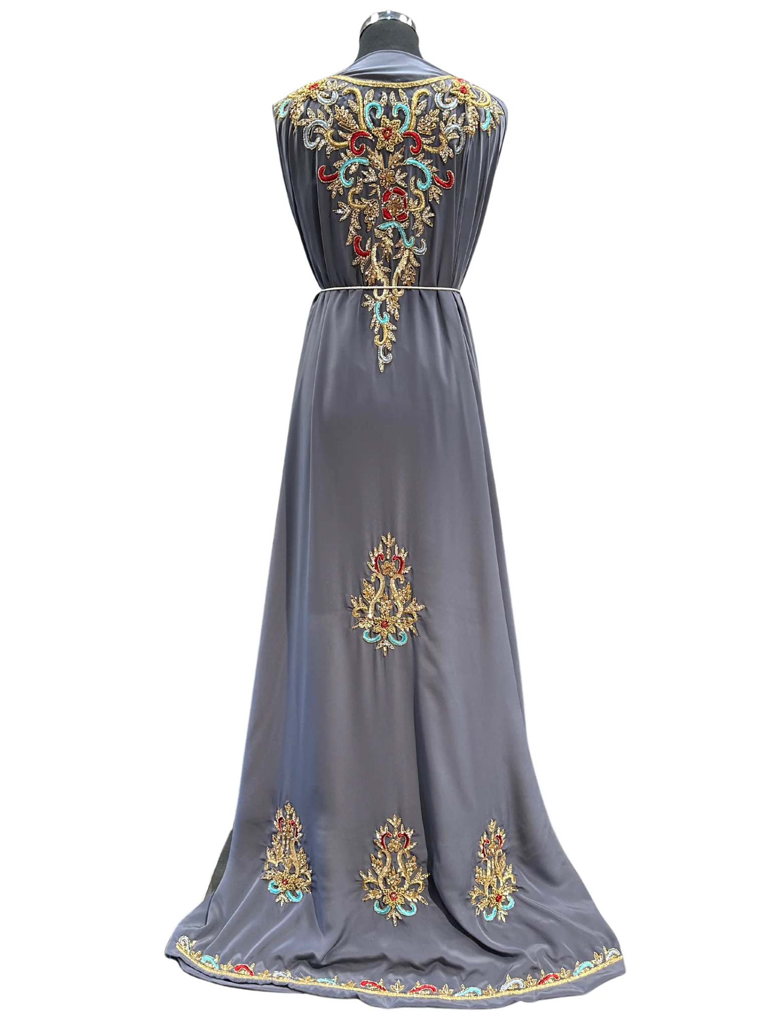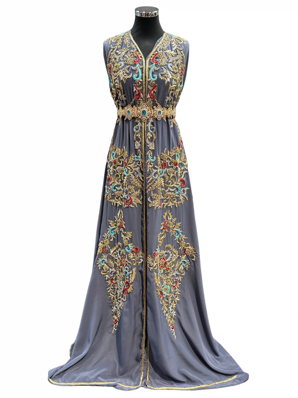 Takchita deux pièces en mousseline légère, aux tons sable et rose poudré, parfaite pour un mariage ou des fiançailles. Un modèle doux et romantique, qui met en valeur la grâce naturelle de celle qui le porte. Elle capture la chaleur du désert et la tendresse des moments précieux.
